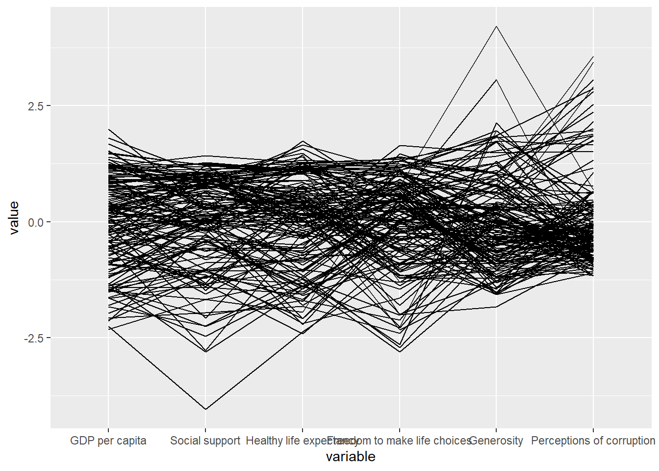 title = "Parallel Coordinates Plot of World Happines Variables")